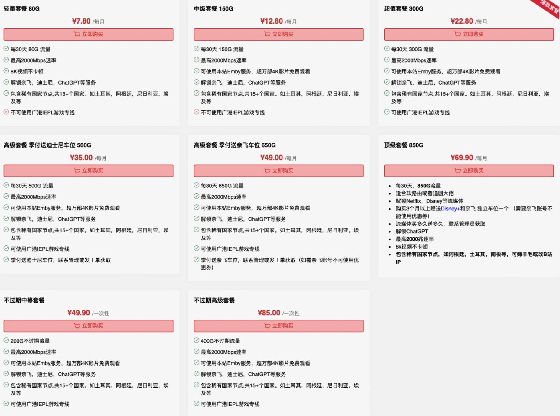 解锁界的天花板: 完美搞定 Netflix、Disney+、ChatGPT 甚至 DMM。最顶的是,购买高级套餐直接送独立位。不用跟人拼车,不用担心被踢掉线。